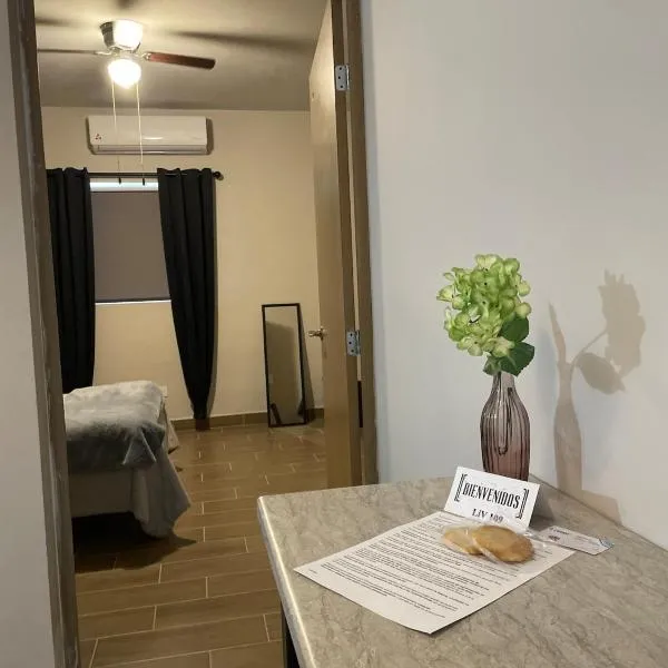 LiV109 Norte Depa 7 Cd Obregon位于索诺拉州的奥夫雷贡城,配有庭院。这家公寓配备花园和免费WiFi。 这家公寓配备1间卧室、1间浴室、床上用品、毛巾、平板电视、用餐区、设施齐全的小厨房以及花园景露台。这家空调公寓还提供休息区以及1间带淋浴设施的浴室。