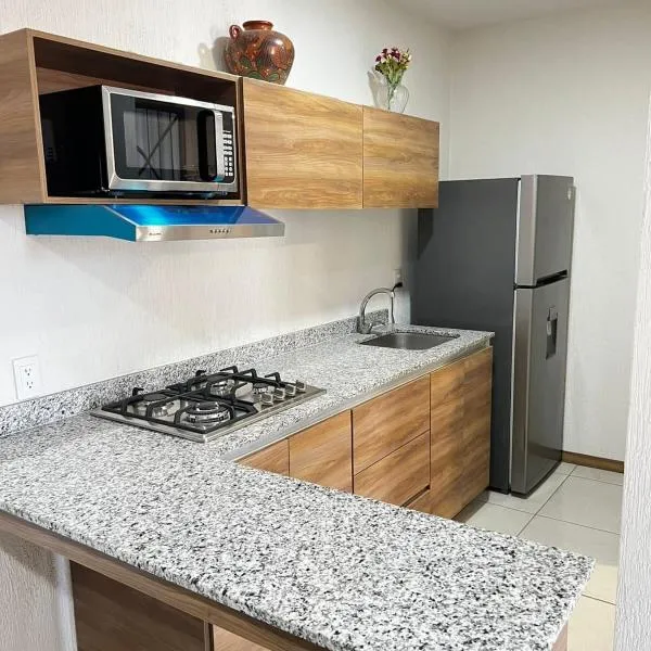 Departamento Tapatío坐落于瓜达拉哈拉,距离Cabanas文化博物馆有7.8公里,配备花园、免费WiFi、客房服务和24小时前台。这家公寓提供免费私人停车位和礼宾服务。 这家公寓提供1间卧室、1间浴室、床上用品、毛巾、带有线频道的平板电视、设施齐全的厨房以及花园景露台。1间浴室提供浴缸或淋浴设施和吹风机。...