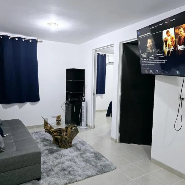 Departamento Villas Doradas位于圣克鲁斯华特库,距离瓦图尔科市中心/鲁塞西塔有2公里,距离瓦图尔科国家公园有8.5公里,提供免费WiFi和空调。住宿距离Tangolunda Golf Course有8.9公里,提供24小时前台。 这家公寓配备2间卧室、1间浴室、床上用品、毛巾、平板电视、设施齐全的厨房以及山景庭院。这家公寓也提供休息区和1间浴室。