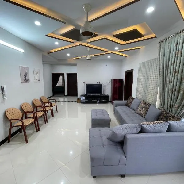 Whispering Fields位于阿伯塔巴德,提供花园和共用休息室。这家度假屋提供免费私人停车位和共用厨房。 这家度假屋提供露台,享有市景,配有4间卧室、起居室、电视、带冰箱和烤箱的设施齐全的厨房以及3间带坐浴盆的浴室。这家度假屋还配备休息区、洗衣机以及3间带淋浴设施的浴室。 这家度假屋配备儿童游乐场供客人使用。 贝娜齐尔·布托国际机场距离住宿有132公里。