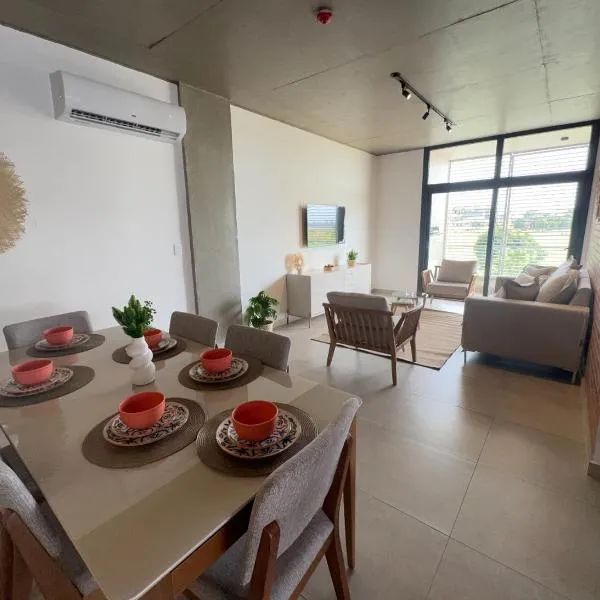 Bello apartamento en edificio Vivo Costanera Frente a la playa! Con Parking位于恩卡纳西翁,配备客房和阳台。这家住宿提供私人泳池、免费WiFi和免费私人停车位。 这家空调公寓配有1间独立卧室、起居室、设施齐全的厨房以及1间浴室。这家公寓也提供1间浴室。 这家公寓距离圣荷西海滩(San Jose)有2分钟步行路程。
