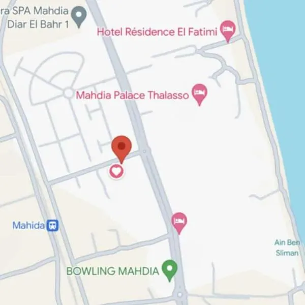 Dar Dhiafa Mayar -دارالضيافةميار坐落于马赫迪耶的海滨,距离阿尔杰姆露天剧场有50公里,距离弗拉明戈高尔夫球场有32公里。这家住宿距离马赫迪耶海滩(Mahdia Beach)有13分钟步行路程,配备露台和免费私人停车位。 这家空调公寓配有1间独立卧室、设施齐全的厨房以及1间浴室。这家公寓也拥有1间浴室。 这家公寓距离莫纳斯提尔棕榈高尔夫球场有48公里。