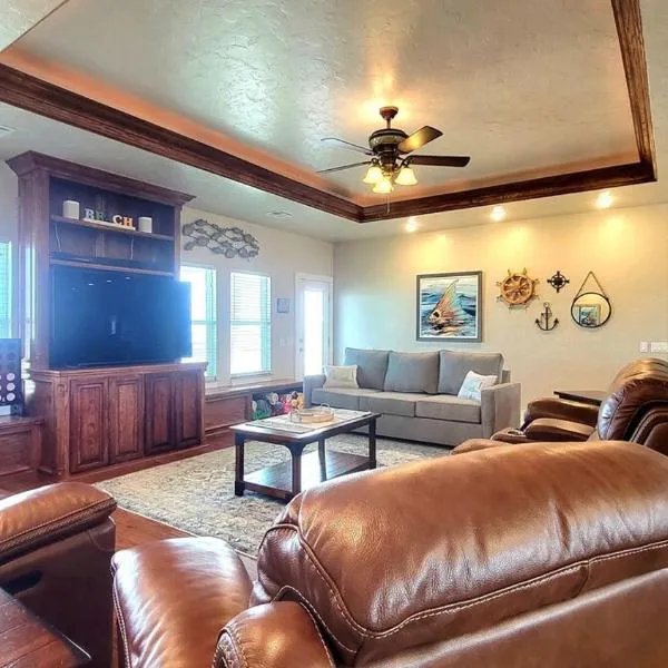 Beach Access Games Firepit Brand New位于Bolivar Peninsula,距离水晶海滩(Crystal Beach)仅有5分钟步行路程,提供花园、水上运动设施和24小时前台。这家度假屋配备阳台。客人可以在周边地区体验潜水、垂钓和浮潜等活动。 这家度假屋配有3间卧室、带有线频道的电视、带冰箱和洗碗机的设施齐全的厨房、洗衣机以及2间带淋浴设施的浴室。