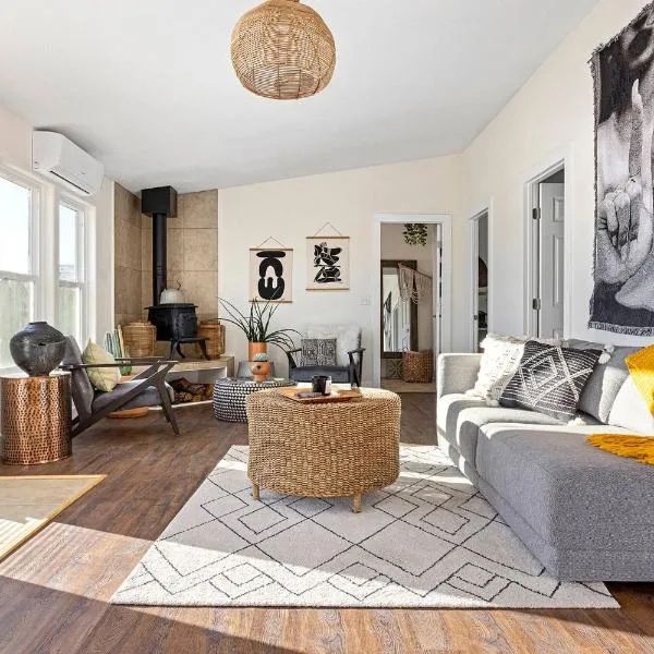 Flamingo Ranch - Dreamy Desert Design with Hot Tub home坐落于Pioneertown。住宿配备免费WiFi,内部提供私人停车位。 这家空调度假屋配有2间独立卧室、带冰箱和洗碗机的设施齐全的厨房以及2间浴室。这家度假屋还配备电视、休息区、洗衣机以及2间带淋浴设施的浴室。 这家度假屋提供热水浴池。 棕榈泉国际机场距离住宿有61公里。