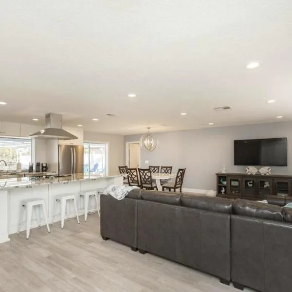 Surfside Beach House - Gorgeous Canal Front Home - Heated Pool & Boat Dock位于阿波罗海滩,配有客房和私人泳池。这家度假屋享有市景,配备游泳池和花园,也为客人提供免费WiFi。 这家空调度假屋配有3间卧室、起居室、带冰箱和电热水壶的设施齐全的厨房以及3间带浴缸和免费洗浴用品的浴室。这家度假屋还提供电视以及3间带吹风机的浴室。