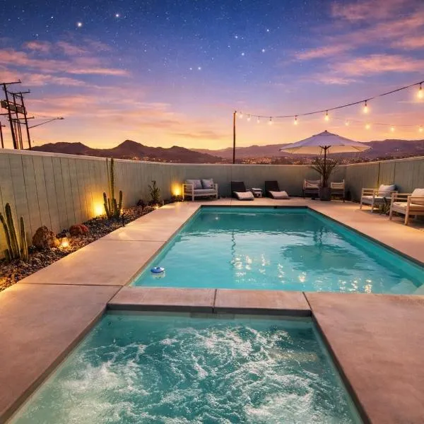 The Outpost Joshua Tree: Hot Tub, GameRoom, JTNP坐落于加利福尼亚州的约书亚树,拥有庭院,享有山景。这家住宿的客人可以使用桌球台、飞镖靶和免费私人停车位。 这家空调度假屋配有3间卧室、起居室、带冰箱和咖啡机的设施齐全的厨房以及2间带淋浴设施和热水浴池的浴室。2间浴室配有浴缸,也配备吹风机,提供毛巾和床上用品。...