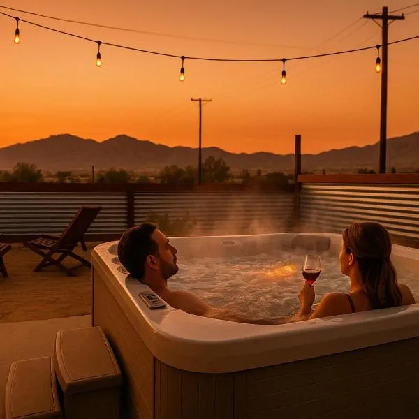 The Outpost Joshua Tree: Hot Tub, GameRoom, JTNP坐落于加利福尼亚州的约书亚树,拥有庭院,享有山景。这家住宿的客人可以使用桌球台、飞镖靶和免费私人停车位。 这家空调度假屋配有3间卧室、起居室、带冰箱和咖啡机的设施齐全的厨房以及2间带淋浴设施和热水浴池的浴室。2间浴室配有浴缸,也配备吹风机,提供毛巾和床上用品。...
