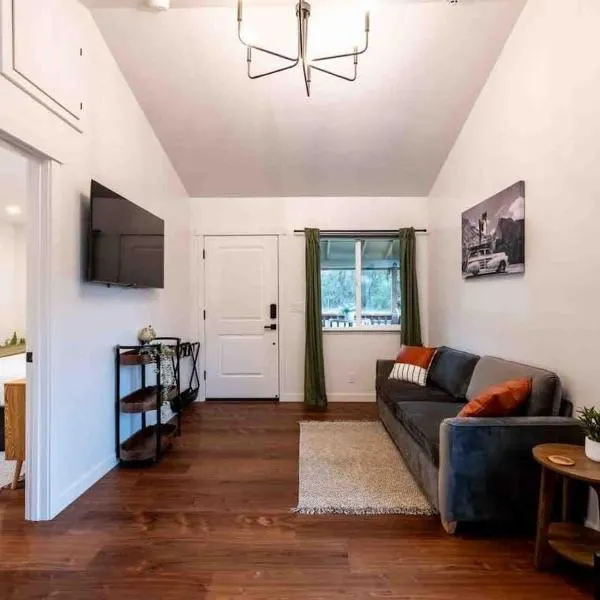Apple Valley Cabin位于索诺拉。这家住宿的客人可以使用庭院、免费私人停车位和免费WiFi。 这家空调度假屋配有2间卧室、起居室、带冰箱和咖啡机的设施齐全的小厨房以及1间带淋浴设施和免费洗浴用品的浴室。这家度假屋还提供平板电视以及1间带吹风机的浴室。 默塞德市机场距离住宿有107公里。