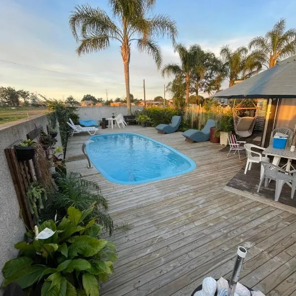 Casa ÍSIS de aluguel por temporada em Capão da Canoa com piscina享有池景,提供季节性室外泳池和阳台,距离新区海滩(Zona Nova Beach)约有6分钟步行路程。这家自助式度假屋配有私人泳池、花园和免费私人停车位。 这家空调度假屋配有4间卧室、起居室、带冰箱和咖啡机的设施齐全的厨房以及3间带淋浴设施的浴室。