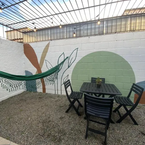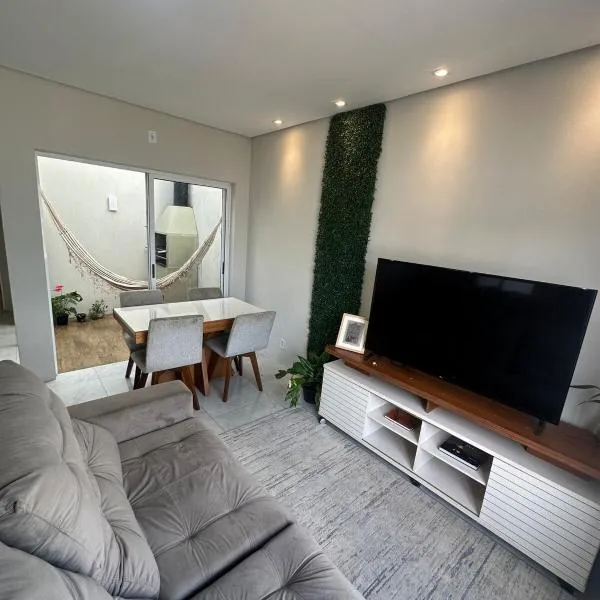 Casatempo Moradas Pelotas Quartier proximo hospital Unimed坐落于南大河州的佩洛塔斯,配有阳台,享有花园景。这家自助式度假屋拥有花园、烧烤设施、免费WiFi和免费私人停车位。 这家空调度假屋配有2间卧室、起居室、带冰箱和电热水壶的设施齐全的厨房以及1间带淋浴设施和免费洗浴用品的浴室。这家度假屋还配备平板电视以及1间带吹风机的浴室。
