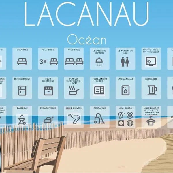 Villa 16 personnes à 50m plage Sud位于拉卡诺的海滨,距离阿尔蒂洛斯-拉卡诺高尔夫球场有4.1公里,距离梅嘉内高尔夫球场有4.3公里。这家空调住宿距离超级南海滩(Plage Super Sud)有3分钟步行路程,为客人提供免费WiFi,内部提供私人停车位。 这家度假屋配有4间卧室、2间浴室、床上用品、毛巾、带有线频道的电视、设施齐全的厨房以及花园景露台。