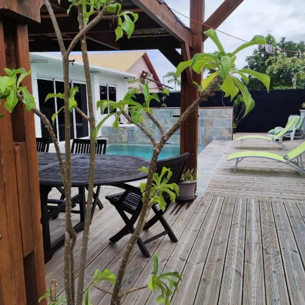 Bungalow accueillant à La Rivière / 28 m² / Piscine privée位于Les Cocos,提供带免费WiFi的池景客房,配备户外游泳池、花园和露台。内部提供私人停车位。 这家1卧室度假屋配备起居室、带卫星频道的电视、带冰箱和烤箱的设施齐全的厨房以及1间带淋浴设施的浴室。这家度假屋也为客人提供休息区和1间浴室。
