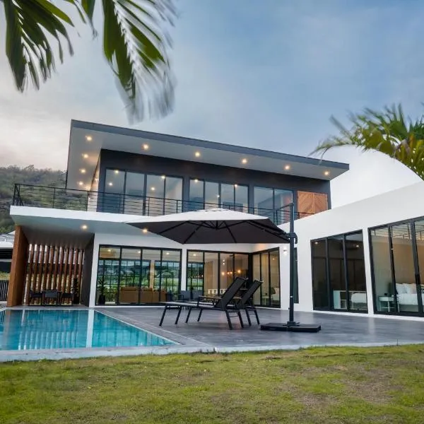 New Private Pool Villa with 3BR - MV77位于Ban Thap Tai (1),享有花园景,配有客房、私人泳池和露台。这家别墅享有山景,配备游泳池和花园,也为客人提供免费WiFi。 这家空调别墅配有3间卧室、起居室、带冰箱和电热水壶的设施齐全的厨房以及2间带淋浴设施和吹风机的浴室。这家别墅也配备2间浴室。