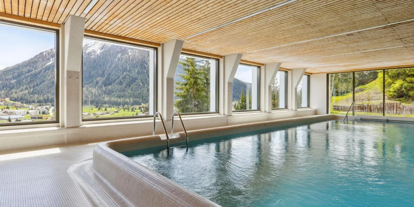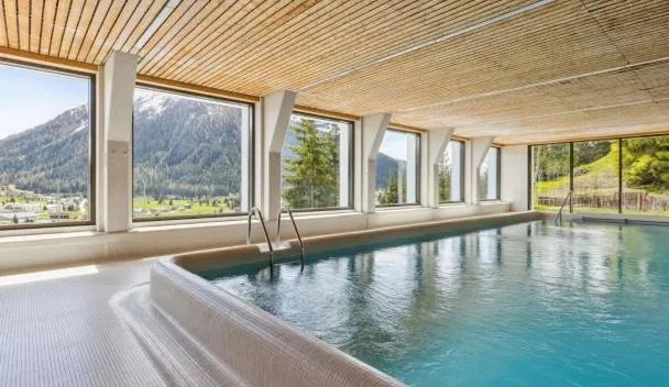 A wellness area and a fitness room await you at the 5-star hotel Flüela Hotel Davos, located directly opposite the train station in Davos Dorf.