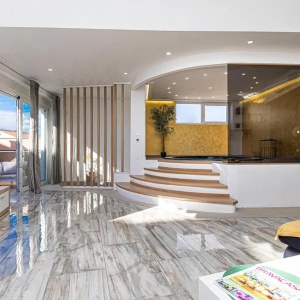 Luxury apartment with jacuzzi in Trogir位于特罗吉尔,提供带免费WiFi的市景客房,配备花园、露台和酒吧。内部提供私人停车位。 这家空调公寓配有2间卧室、起居室、带冰箱和咖啡机的设施齐全的厨房以及1间带淋浴设施和热水浴池的浴室。这家公寓还配备休息区、洗衣机以及1间带免费洗浴用品的浴室。 这家公寓的客人可以使用热水浴池。