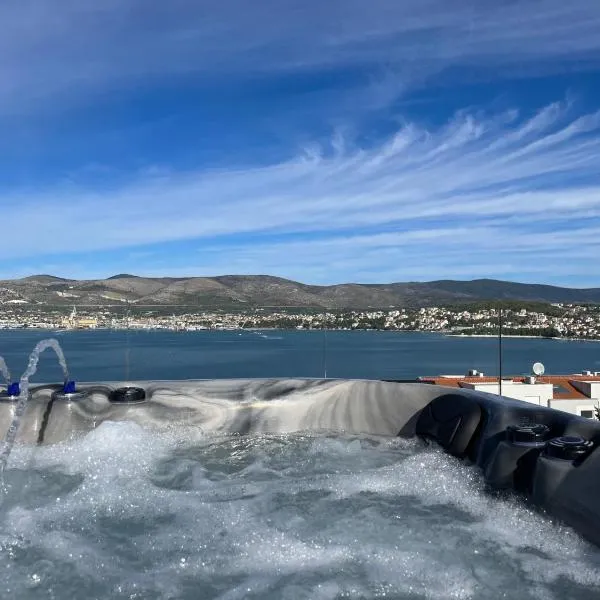 Luxury apartment with jacuzzi in Trogir位于特罗吉尔,提供带免费WiFi的市景客房,配备花园、露台和酒吧。内部提供私人停车位。 这家空调公寓配有2间卧室、起居室、带冰箱和咖啡机的设施齐全的厨房以及1间带淋浴设施和热水浴池的浴室。这家公寓还配备休息区、洗衣机以及1间带免费洗浴用品的浴室。 这家公寓的客人可以使用热水浴池。