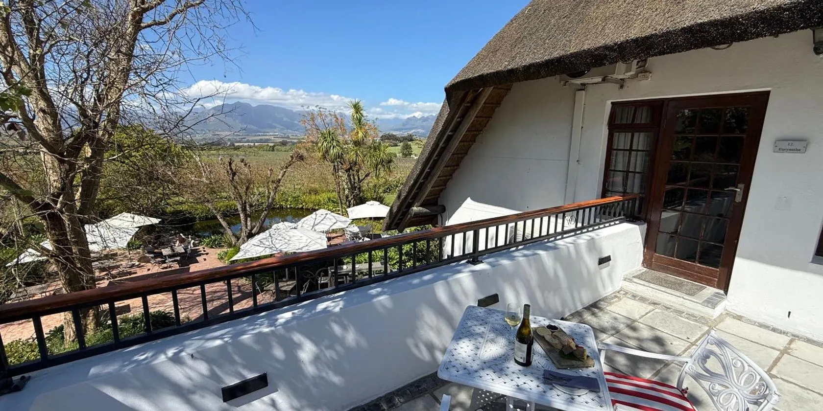 A typical English cottage with landscaped gardens houses this lodge in the Western Cape Winelands. A palm-framed oval pool is the focus of this quiet hideaway.