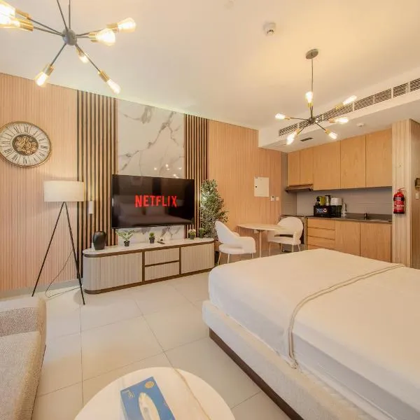 1 BR Luxury Apt by AJ Aljada位于沙迦,提供带免费WiFi的池景客房,配备户外游泳池、花园和露台。这家住宿提供私人泳池和免费私人停车位。 这家空调公寓配有1间卧室、起居室、带冰箱和咖啡机的设施齐全的厨房以及1间带坐浴盆和淋浴设施的浴室。1间浴室配有热水浴池,也提供免费洗浴用品,提供毛巾和床上用品。...