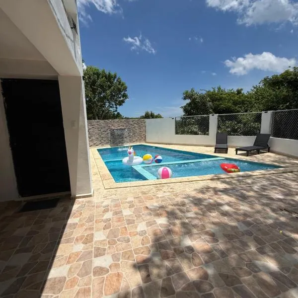 Hacienda La Huerta Puerto Plata, 2 BDR坐落于Maimón,距离皮克迪迭戈仅有35公里,提供户外游泳池、酒吧和免费WiFi。这家自助式度假屋拥有私人泳池、花园和免费私人停车位。 这家度假屋享有花园景,配备露台,配有2间卧室、起居室、有线频道平板电视、设施齐全的厨房以及1间带淋浴设施和浴缸的浴室。这家度假屋还配备休息区、洗衣机以及1间带免费洗浴用品的浴室。...