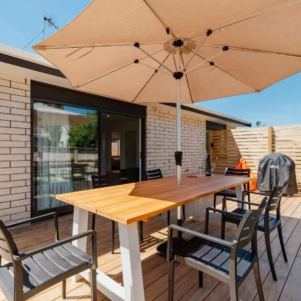 Seaside Chalet Papamoa享有花园景,配备露台和庭院,距离ASB湾园体育场约有12公里。这家住宿距离帕帕摩亚海滩(Papamoa Beach)有2.2公里,提供花园和免费私人停车位。 这家空调度假屋配有3间卧室、起居室、带冰箱和电热水壶的设施齐全的厨房以及1间带淋浴设施和免费洗浴用品的浴室。1间浴室配有浴缸,也提供吹风机,提供毛巾和床上用品。...