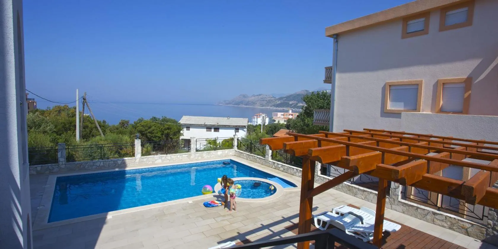 Modern apartment with sea view in Dobra Voda, 95 m², Pool坐落于多布拉沃达,提供季节性室外泳池,距离巴尔港有13公里,距离斯卡达湖有35公里,距离圣斯特凡岛有42公里。这家空调住宿距离維里基皮耶薩海灘(Veliki Pijesak)有5分钟步行路程,为客人提供免费WiFi,内部提供私人停车位。