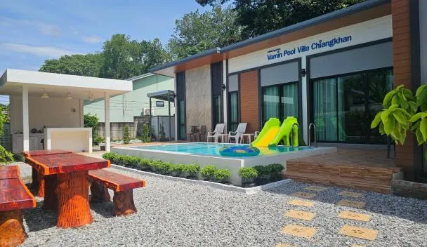 เคียงโขงพูลวิลล่าเชียงคานKiang Khong Pool Villa de Chiang Khan位于清刊,提供带免费WiFi的池景客房,配备户外游泳池、花园和共用休息室。这家住宿提供私人泳池和免费私人停车位。 这家空调度假屋配有3间卧室、起居室、带冰箱和电热水壶的设施齐全的厨房以及2间带淋浴设施和吹风机的浴室。这家度假屋也拥有休息区和2间浴室。...
