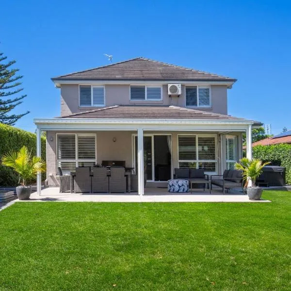 Wavesong on Watts - Pet Friendly with Spa位于新南威尔士的卡拉拉海滩,拥有阳台。这家自助式度假屋配有花园、烧烤设施、免费WiFi和免费私人停车位。 这家度假屋配备4间卧室、2间浴室、床上用品、毛巾、带有线频道的平板电视、用餐区、设施齐全的厨房以及花园景露台。这家空调度假屋还提供休息区、洗衣机以及2间带淋浴设施和热水浴池的浴室。