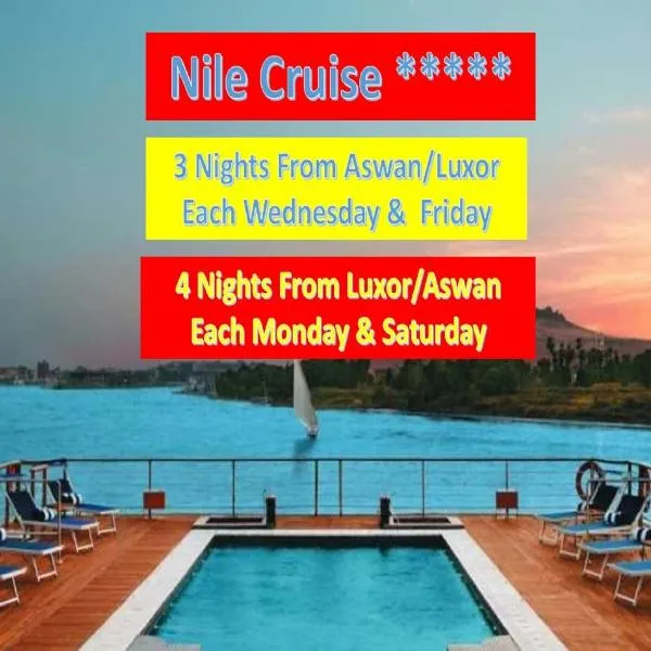 Nile Cruises 5 Stars From From Aswan 03 Nights -From Luxor 04 Nights位于卢克索,距离Luxor Train Station有13分钟步行路程,提供季节性室外泳池、私人停车位、花园和露台。这家住宿提供的设施包括餐厅、免费班车服务、客房服务和免费WiFi。客人可以使用酒吧。