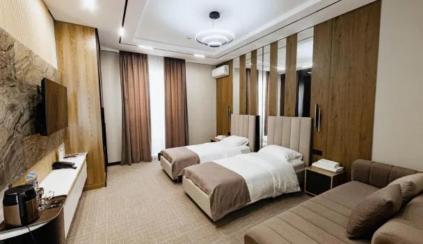 Barhat Hotel & SPA位于塔拉兹,提供酒吧和spa&康体中心。这家住宿提供的设施包括餐厅、客房服务、24小时前台以及免费WiFi。这家住宿配有全年开放的室外泳池、室内泳池、桑拿房和花园。 所有房间均配备空调、带有线频道的平板电视、迷你吧、电热水壶、坐浴盆、免费洗浴用品和书桌。所有客房都配有带淋浴设施、吹风机和拖鞋的私人浴室。这家酒店的所有客房都提供床上用品和毛巾。...