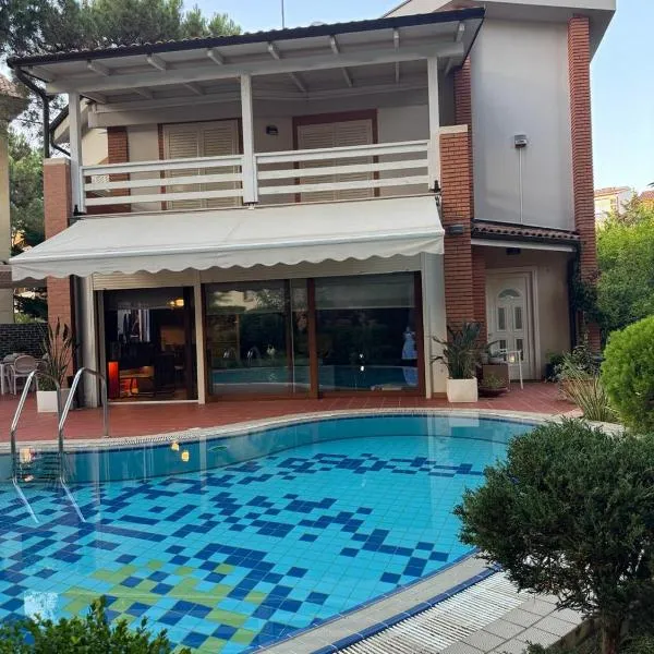 Green Villa with Private Pool坐落于都拉斯,配有室外泳池,享有海景。这家自助式别墅拥有私人泳池、花园和免费私人停车位。 这家别墅享有市景,配备露台,配有3间卧室、起居室、平板电视、设施齐全的厨房以及2间带淋浴设施的浴室。这家空调别墅还配备休息区、洗衣机以及2间带免费洗浴用品的浴室。 这家别墅距离斯堪德尔伯格广场有36公里,距离达吉特缆车有40公里。
