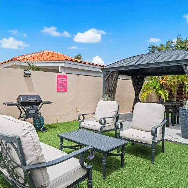 2br Aruba Comfort Retreat W Pool, Bbq & Gated!距离瑟夫赛德海滩(Surfside Beach)约有2.8公里,提供室外泳池和免费WiFi。这家自助式度假屋拥有私人泳池、花园和免费私人停车位。 这家空调度假屋配有2间卧室、起居室、带冰箱和咖啡机的设施齐全的厨房以及1间带淋浴设施和免费洗浴用品的浴室。这家度假屋还配备休息区、洗衣机以及1间带吹风机的浴室。