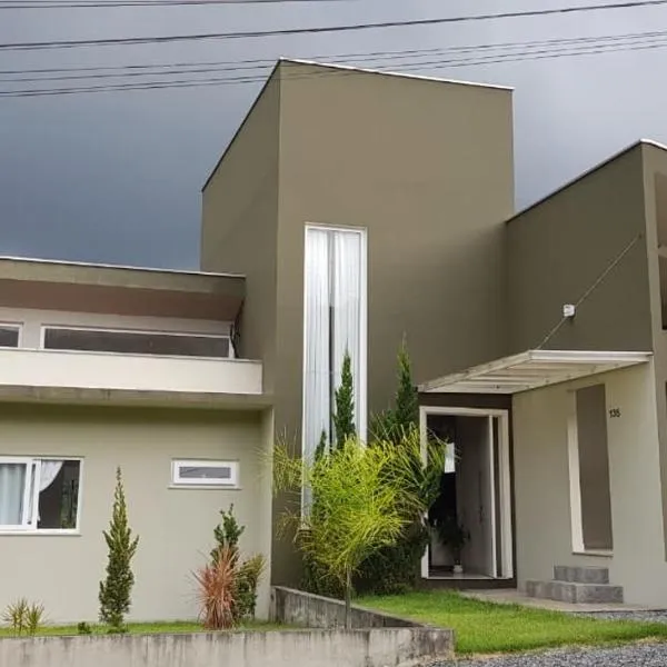 Casa enxaimel 01 em Pomerode享有花园景,配备露台和阳台,距离德国村约有31公里。这家住宿距离布鲁梅瑙巴士站有29公里,提供花园和免费私人停车位。 这家空调度假屋配有3间卧室、起居室、带冰箱和咖啡机的设施齐全的厨房以及3间带淋浴设施的浴室。这家度假屋也拥有休息区和3间浴室。 这家度假屋距离Theather Carlos...