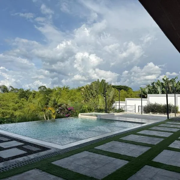 Casa con piscina privada fincas panaca, Quindío位置很好,位于金巴亚,配有室外泳池和24小时前台,距离Ukumari Zoo有41公里,距离帕纳卡有几步路。这家自助式度假屋配有私人泳池、花园、烧烤设施、免费WiFi和免费私人停车位。 这家度假屋提供露台,享有池景,拥有5间卧室、起居室、平板电视、带冰箱和烤箱的设施齐全的厨房以及6间带淋浴设施的浴室。