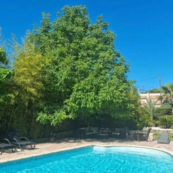 L'eden Provençal位于Les Saquetons,配有全年开放的室外泳池,配备免费WiFi,还为驱车前来的客人提供免费私人停车位。 房间配有露台、空调、电视以及带淋浴设施和吹风机的私人浴室。住宿还配备冰箱和微波炉以及咖啡机和电热水壶。 这家别墅的客人可在附近体验骑行,或使用花园。