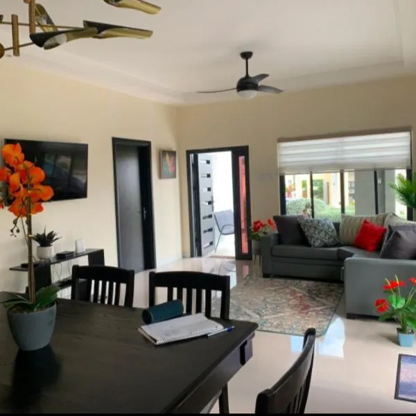 Jus4U-1 The Home Away From Home Villa坐落于欧丘里欧。这家住宿距离马米湾海滩(Mammee Bay Beach)有2.7公里,配备花园和免费私人停车位。 这家度假屋提供庭院,享有花园景,拥有2间卧室、起居室、平板电视、带冰箱和烤箱的设施齐全的厨房以及1间带淋浴设施的浴室。这家度假屋也配备休息区和1间浴室。 这家度假屋提供汽车租赁服务。