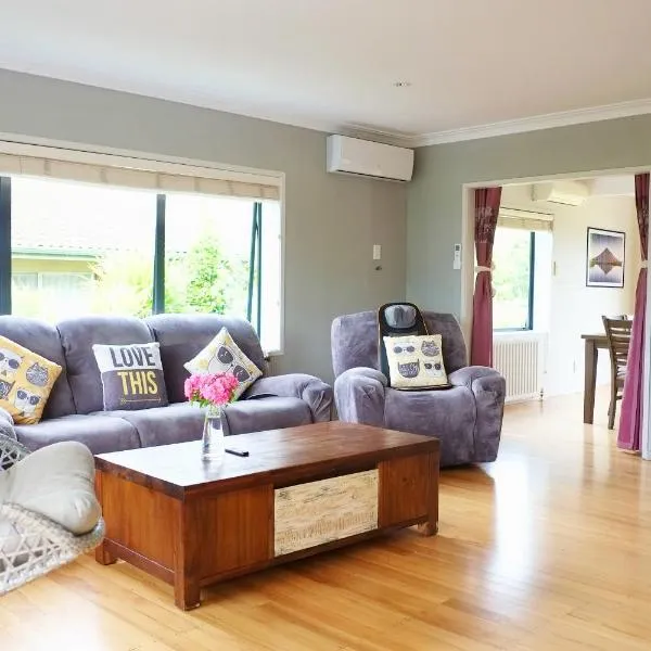 Macadamia Retreat - City Central Hygge享有花园景,提供露台和庭院,距离罗托鲁阿国际体育场约有1.9公里。这家自助式度假屋配有花园、烧烤设施、免费WiFi和免费私人停车位。 这家空调度假屋配有4间卧室、起居室、带冰箱和电热水壶的设施齐全的厨房以及2间带淋浴设施和免费洗浴用品的浴室。2间浴室配有浴缸,也提供吹风机,提供毛巾和床上用品。