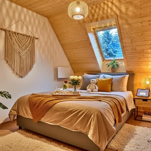 Domek nad Stawem享有山景,配备露台和庭院,距离波兰尼卡兹罗杰火车站约有10公里。这家自助式度假屋拥有花园、烧烤设施、免费WiFi和免费私人停车位。 这家空调度假屋配有2间卧室、起居室、带冰箱和咖啡机的设施齐全的厨房以及1间带淋浴设施和吹风机的浴室。这家度假屋也配有1间浴室。 如果客人想探索该地区,可以在周边地区体验垂钓。